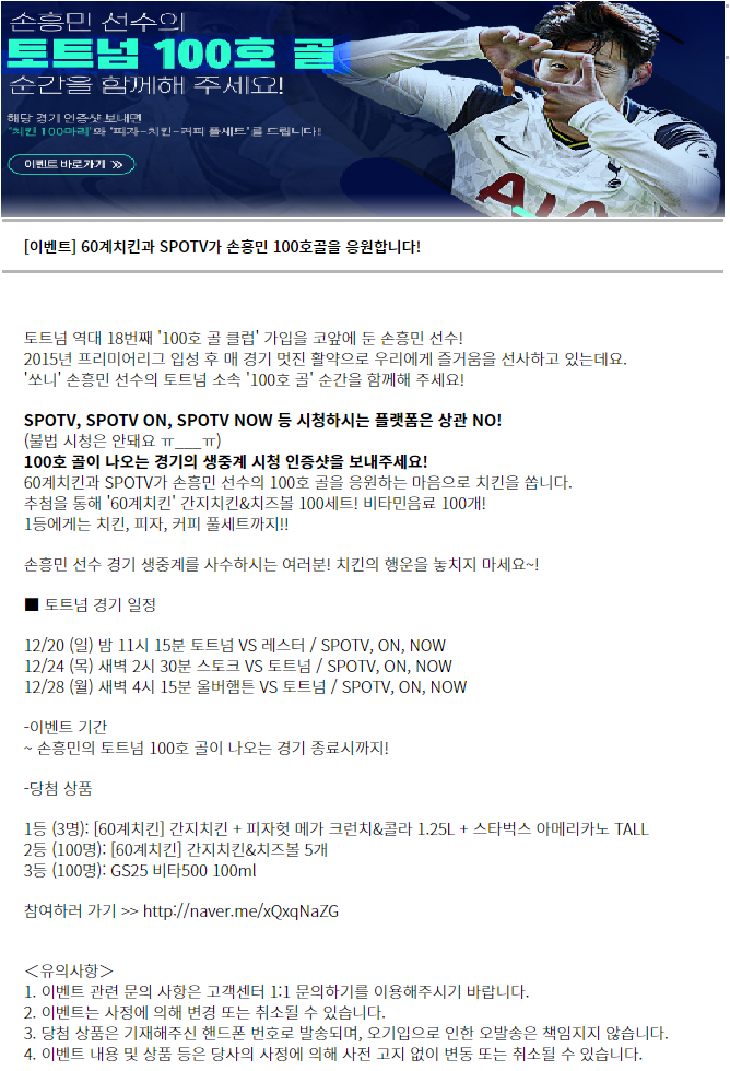 그리고 스포티비에서 손흥민 선수의 토트넘 100호 골이벤트도 진행합니다. 참조하시기 바랍니다!