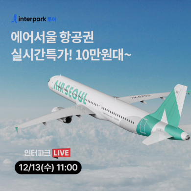 2023년 12월 13일 11시 에어서울 인터파크 투어 라이브 인기노선 라이브 특가! 왕복 항공권 경품 추첨 오퀴즈 문제 : 12/13(수) 오전 11시, 인터파크 라이브에서 에어서울 항공 최대 32% 할인된 가격으로 만나보세요!