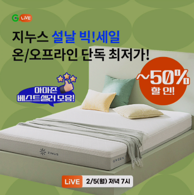 2024년 2월 5일 7시 G라이브 설날 빅 세일 매트리스 설 빅세일 특가 온 오프라인 단독 최저가 오퀴즈 문제 : G 설날 빅! 세일 '지누스'