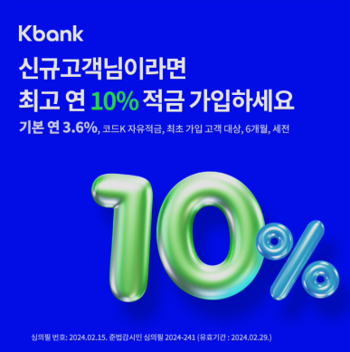 Kbank 신규고객님이라면 최고 연 10% 코드K자유적금 마감되기 전 선착순 가입하세요 오퀴즈 정답 2월 21일 6시 오퀴즈 정답 : 10 입니다!