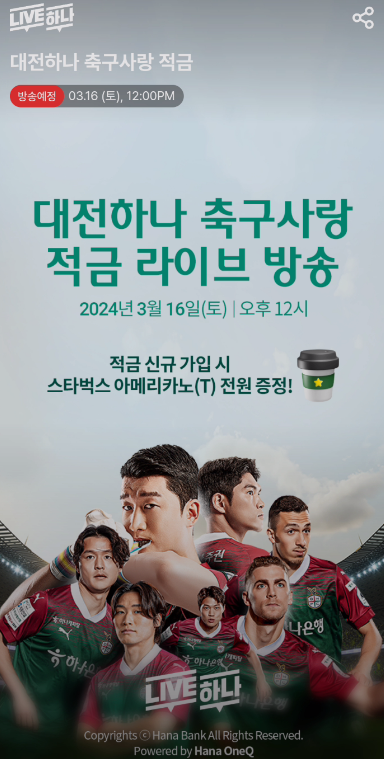 3월 16일 12시 하나은행 대전하나 축구사랑 적금 라이브 방송 적금 가입 커피 1잔 전원 증정 ㄷㅈㅎㄴㅅㅌㅈ 오퀴즈 정답! 오퀴즈 정답은?