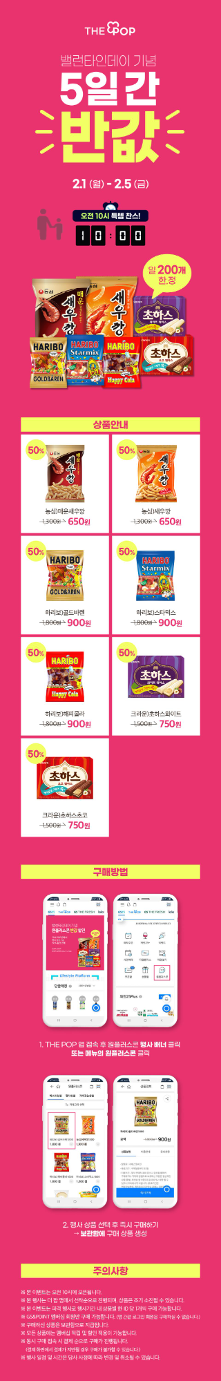 2월 1일~5일까지 선착순으로 진행되는 행사로 상단의 제품들을 50% 할인된 가격으로 보관함께 구매 저장할 수 있습니다. 새우깡이나 하리보 같은 제품들이 50% 라니 저도 당장 결제해야 할 듯합니다. 주의사항 참고하시고 꼭 오전 10시 이후부터 참여하시기 바랍니다!
