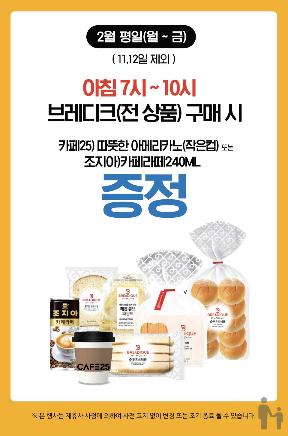 신규 브랜드 런칭으로 브레이크 행사가 많은 것으로 보입니다. 브레이크 상품 구매하시고 아메리카노, 조지아 커피 받아가시기 바랍니다!!! 아침 식사로 딱인 구성이네요.