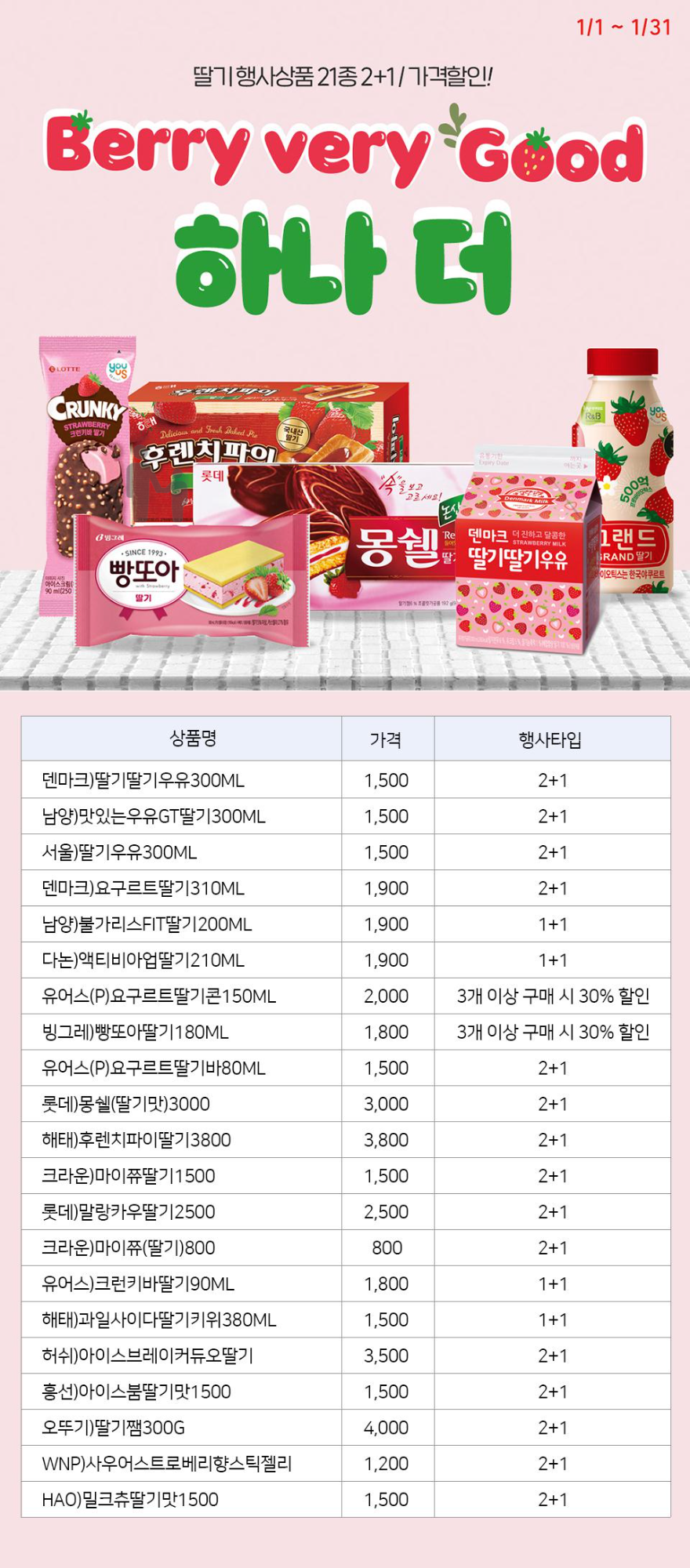 상단의 행사 딸기 제품들을 2+1로 구매하실 수 있습니다. 참조하셔서 할인된 금액으로 구매 하시기 바랍니다!!!