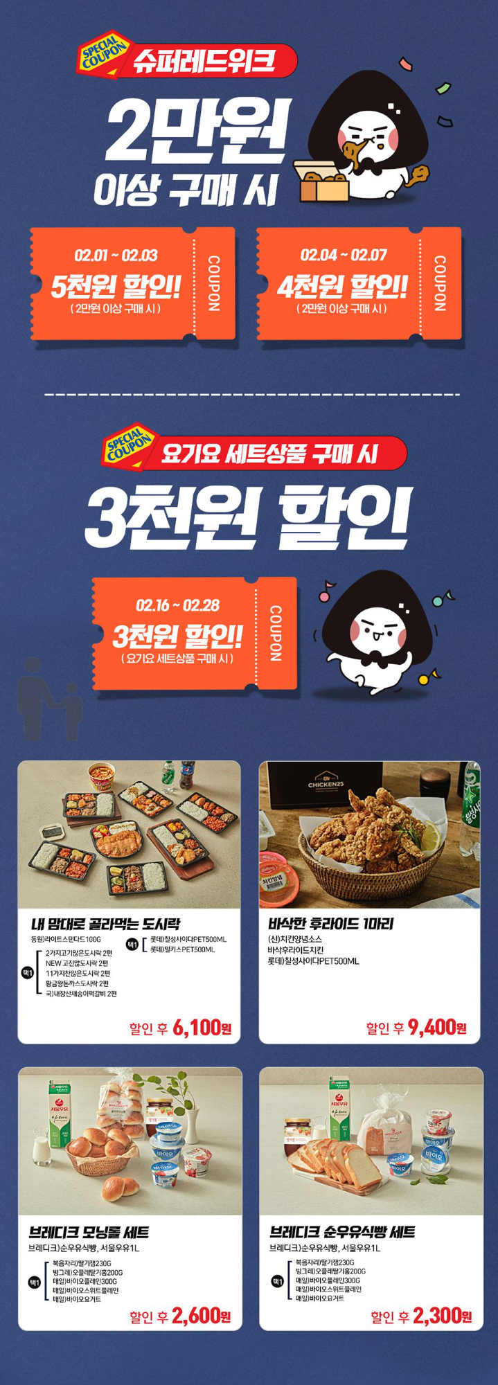 도시락+치킨+브레디크 캄보 행사를 요기요와 콜라보했습니다. 슈퍼레드 위크에 캄보 상품 구매까지 한다면 꽤 저렴하게 구매 가능할 듯합니다. 브레디크와 우유 세트도 꽤 좋은 행사네요 저도 보고 참여해봐야겠습니다!!!