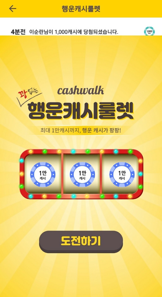 캐시 워크 룰렛은 외부 메뉴에도 있으며 내부 게임 속에도 찾을 수 있습니다. 처음 들어갈 때 광고를 시청한 후 5회룰렛을 진행하며 참여 기회 소진 후 다시 광고 시청 후들어가서 5회 진행을 할 수 있습니다. 해당 룰렛은 3개의 화면에서 동일한 금액이 뜨면 해당금액 지급 다른 금액이 뜨게 되면 1 캐시가 지급됩니다. 최대 10,000캐시까지 랜덤하게 지급되니 틈날때마다 도전해보시면 도움이 될듯 합니다.