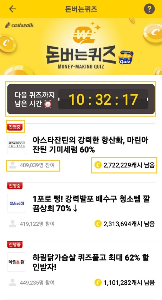 캐시 워크에 핵심 기능인 캐시워크 돈 버는 퀴즈입니다. 일정한 퀴즈 가등록이 되고 위의 다음 퀴즈까지 남은 시간이 되면 추가 퀴즈가 생성됩니다. 퀴즈 캐시가 적립 가능한 퀴즈는 상단에 진행 중이라고 뜨며 아래 참여자 수와 남은 캐시로 잔여 시간을 추정할 수 있습니다. 아래 포인트가 전체 소진되면 참여할 수 없으니 상시 체크가