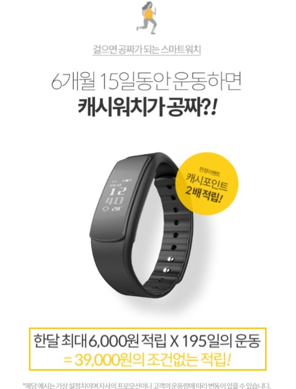 캐시워크 연동 스마트밴드인 캐시워치를 사용할 경우 100 캐시에 + 100 캐시가 되어 한 달에 최대 6,000캐시 적립 가능합니다. 물론 30일 기준으로 매일 10,000보를 걸어야 적립이 가능합니다. 평소 운동을 자주 하시거나 스마트 워치 구매 계획이 있으시다면 고려해볼 만합니다.
