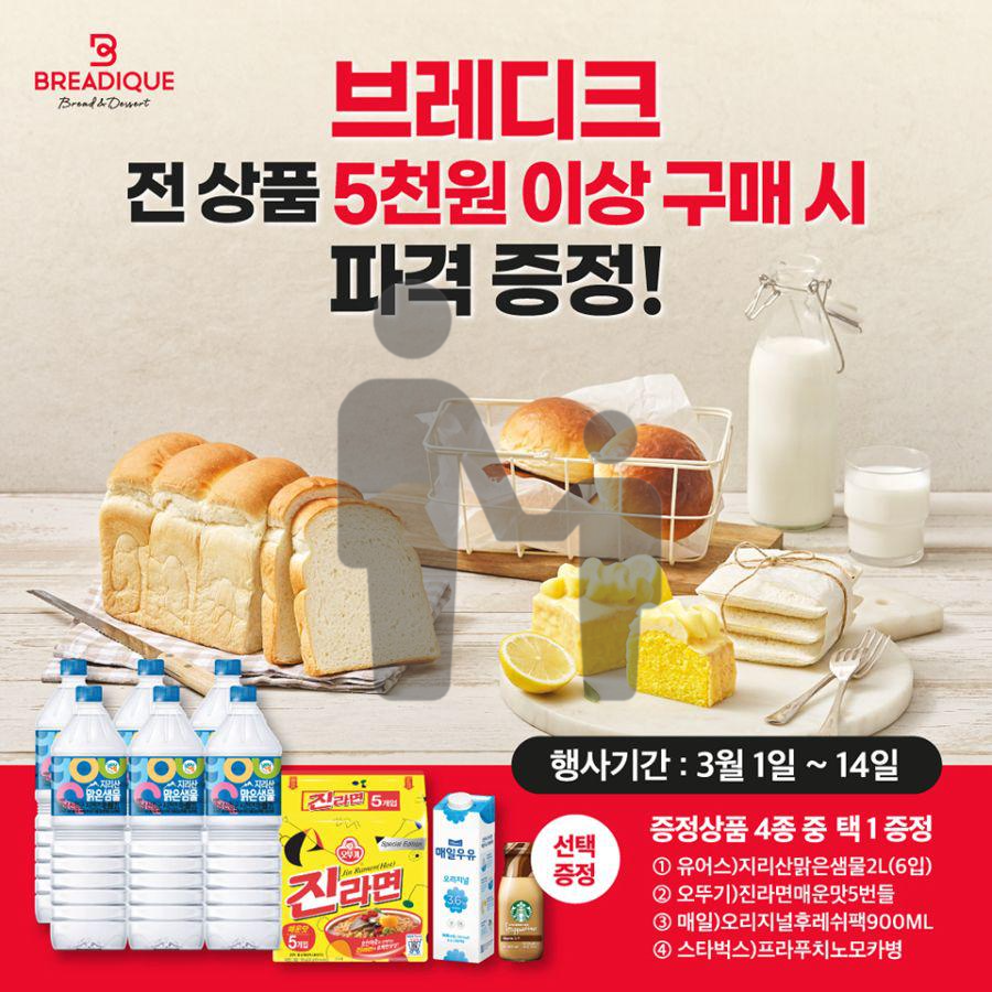 브레디크 전 상품 5천원 이상 구매시 파격 증정 이벤트 입니다. 브레디크 5천원 이상 구매시 지리산 맑은 샘물 생수 6명 또는 진라면 매운맛 5번들 또는 매일우유 오리지널후레쉬팩 900ML 또는 스타벅스프라푸치노모카병 택 1 입니다. 브레디크 제품 구매시 참조 하셔서 증정상품 꼭 획득 하시기 바랍니다!!!