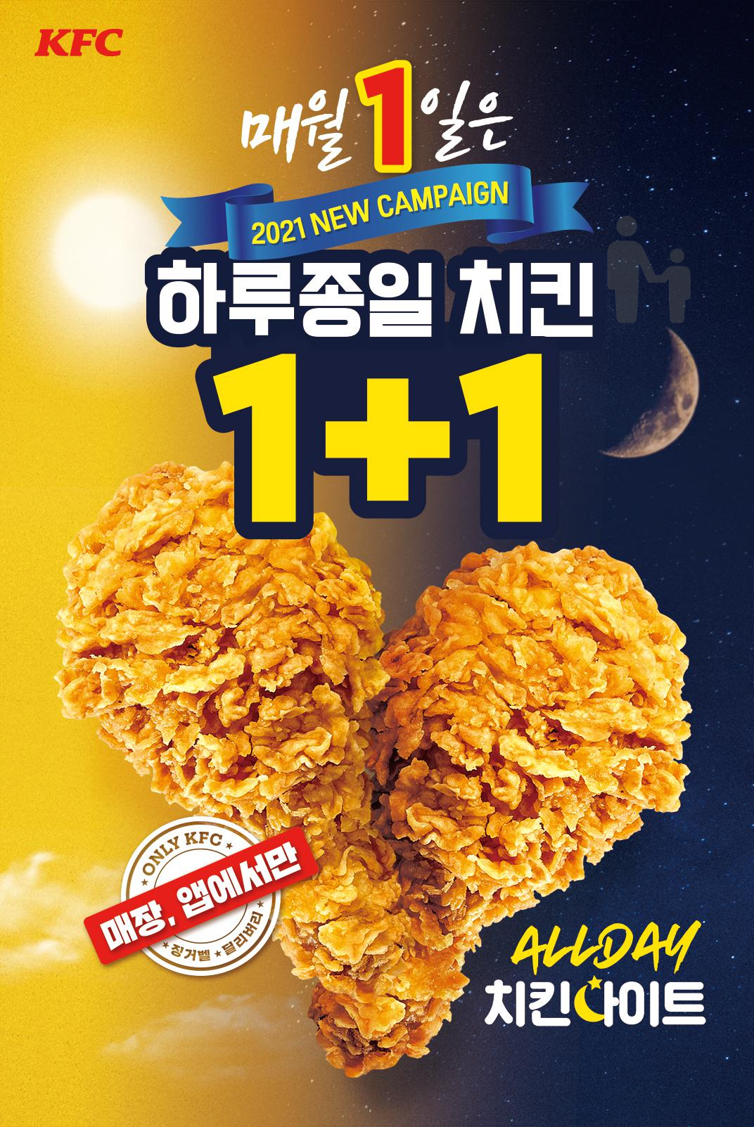 매월 1일은 올데이 치킨나이트 매일밤 9시 이후 진행되는 치킨 1+1 혜택을 하루종일 만나볼 수 있는 이 기회를 놓치지 마세요