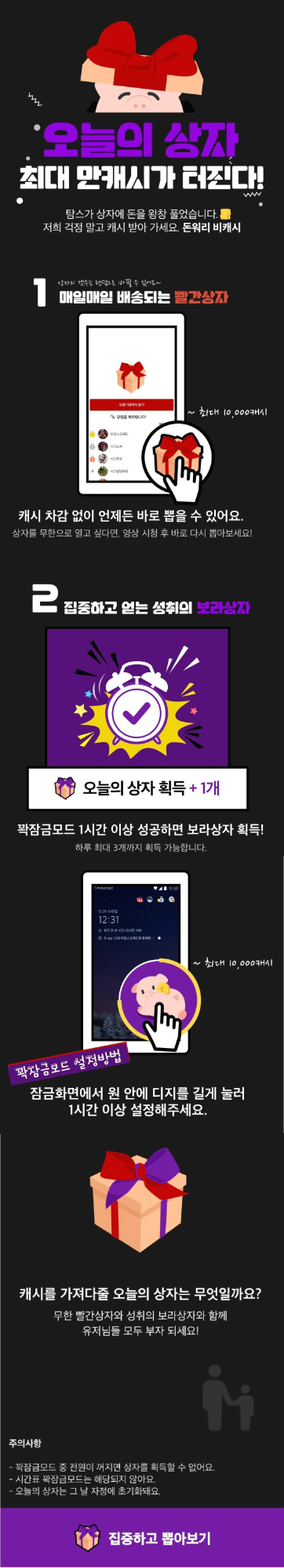 빨간상자는 매일 기본 5개가 지급이 되며 광고 시청시 3개가 지급이 됩니다. 상자를 열면 최대 10,000 캐시까지 나오지만 대부분 1~5 사이가 많은 편입니다. 그리고 보라상자는 최소 1시간 이상 꽉 잠금으로 획득 가능하며 1일 최대 3번까지 획득 가능합니다. 다만 꽉잠금 상태를 중간에 해제하게 되면 10 캐시의 손실을 보게 되니 업무 또는 수면 시 활용하는 것이 도움이 될 듯합니다.(위의 사진은 소멸 캐시가 아까워서... 1시간 이하로 설정하니 소멸 캐시가 0으로 뜹니다. 1시간 이상 설정 후 해제를 하게 되면 -10 캐시가 됩니다.)