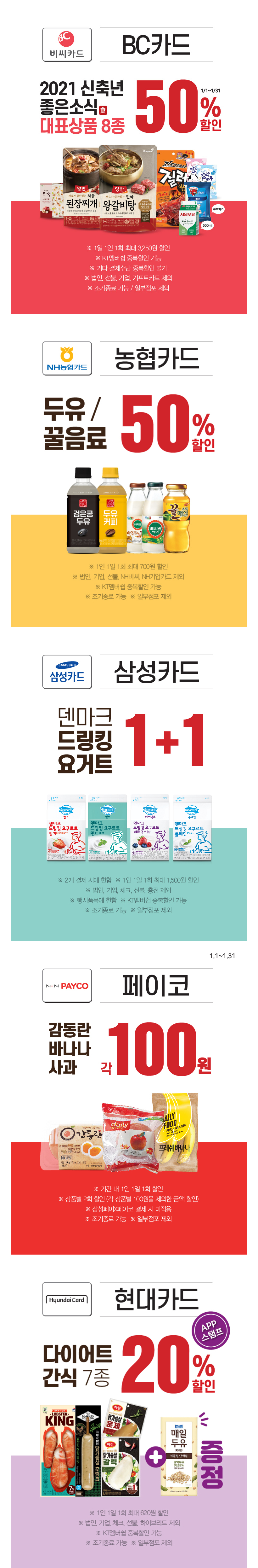 2021년 행사나 프로모션이 벌써 나오고 있습니다. 편의점이 행사에 통신사 할인까지 받으면 일부 품목은 마트보다도 더욱 저렴하게 구매하실 수 있습니다. 월별 행사 정리하여서 공유 드릴 예정이며 참조하셔서 조금 더 저렴한 소비생활하시기 바랍니다. 감사합니다. 건강 조심하시고 행복한 하루 보내세요!!!