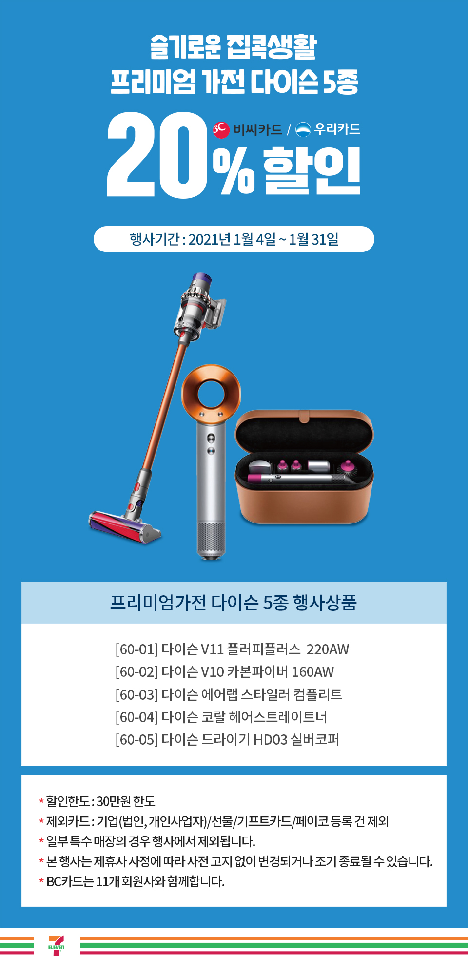 뜬금없는 다이슨 판매이긴 한데 롯데 계열사에 하이마트가 있는 것을 알면 이것도 크게 신기한 일은 아닙니다. 오히려 전자제품 판매의 채널 다각화를 통한 개인 편의점의 소규모 전자제품 판매 채널로 활용한다는 면에서 역시 대기업 롯데라는 생각이 들었습니다. 사설이 길었습니다. 우리 카드. 비씨카드 사용 시 20% 할인이 되니 구매 계획이 있으신 분들은다른 판매 채널과 비교 후 저렴한 가격이면 구매에 도움이 될 듯합니다.