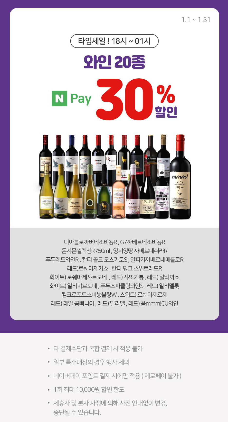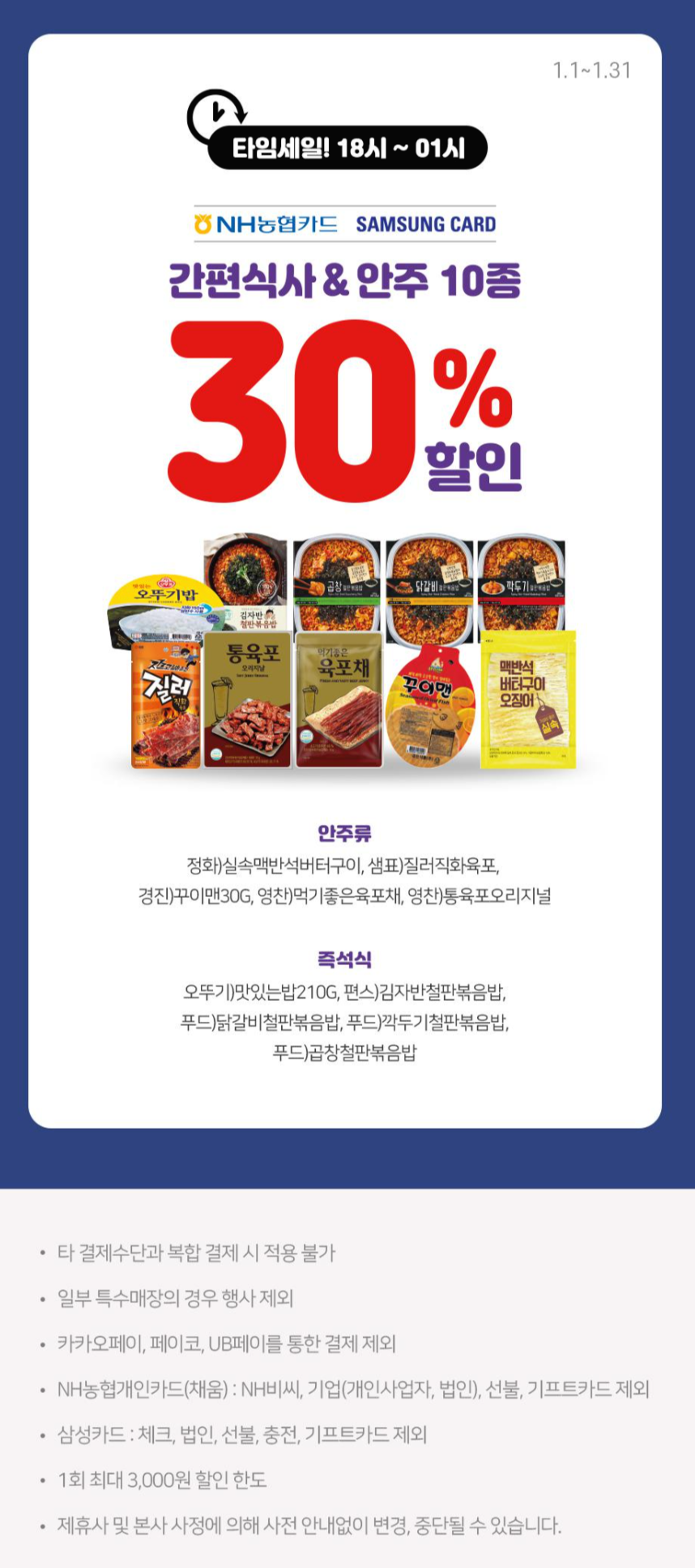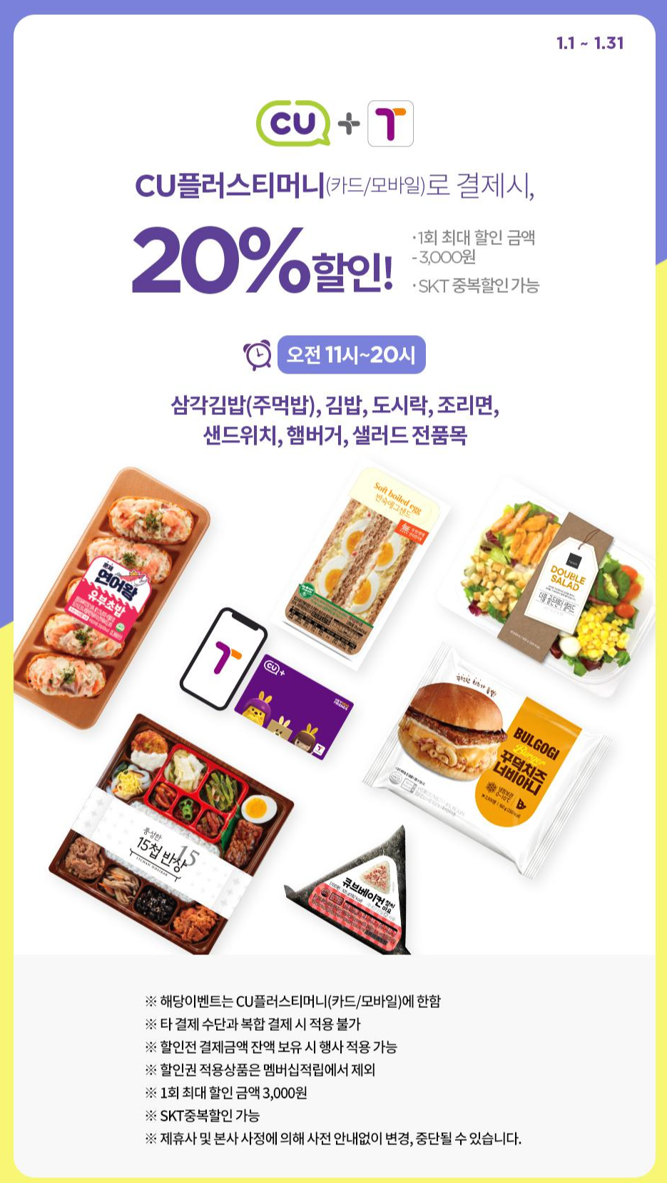 CU플러스티머니 카드로 간편식 구매 시 20% 할인됩니다. 오전 11시~20시까지 타임세일이며 1회 최대 3,000원 SKT 통신사 카드 중복 할인되니 참조하시기 바랍니다. NH농협카드와 삼성카드 사용 시 18시~1시까지 안주, 간편식 타임세일 진행됩니다. 카카오페이나 페이코 등을 경유하여 결제 시 제외되니 그 점 참조하시기 바랍니다.
