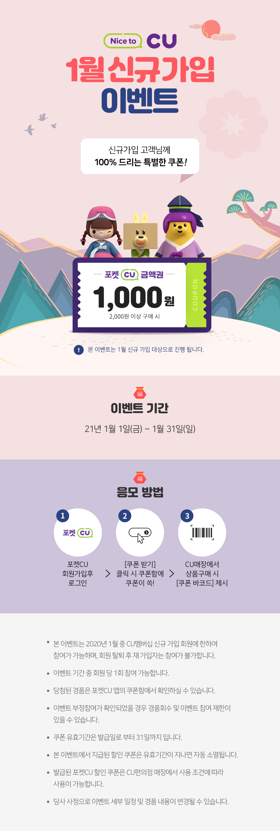 포켓 CU 신규 가입 시 2,000원 이상 사용 가능한 1,000원 쿠폰이 지급됩니다. 포켓 CU 관련 행사가 많으니 가입하여서 쿠폰도 받으시고 이벤트 참여하시기 바랍니다. 그리고 포켓 CU 어플 안에 출석체크 이벤트가 있으니 참여하셔서 포인트 지속적으로 획득 하시기 바랍니다. 일종의 앱테크 개념이라 보면 될듯합니다.