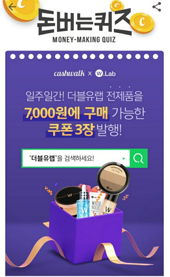 캐시워크 돈버는퀴즈 정답은? "더블유랩 전제품 7000원 구매 쿠폰!!!" 퀴즈 정답 체크 후 랜덤 캐시 받아가세요! 오늘의 캐시워크 정답을 알아보겠습니다.