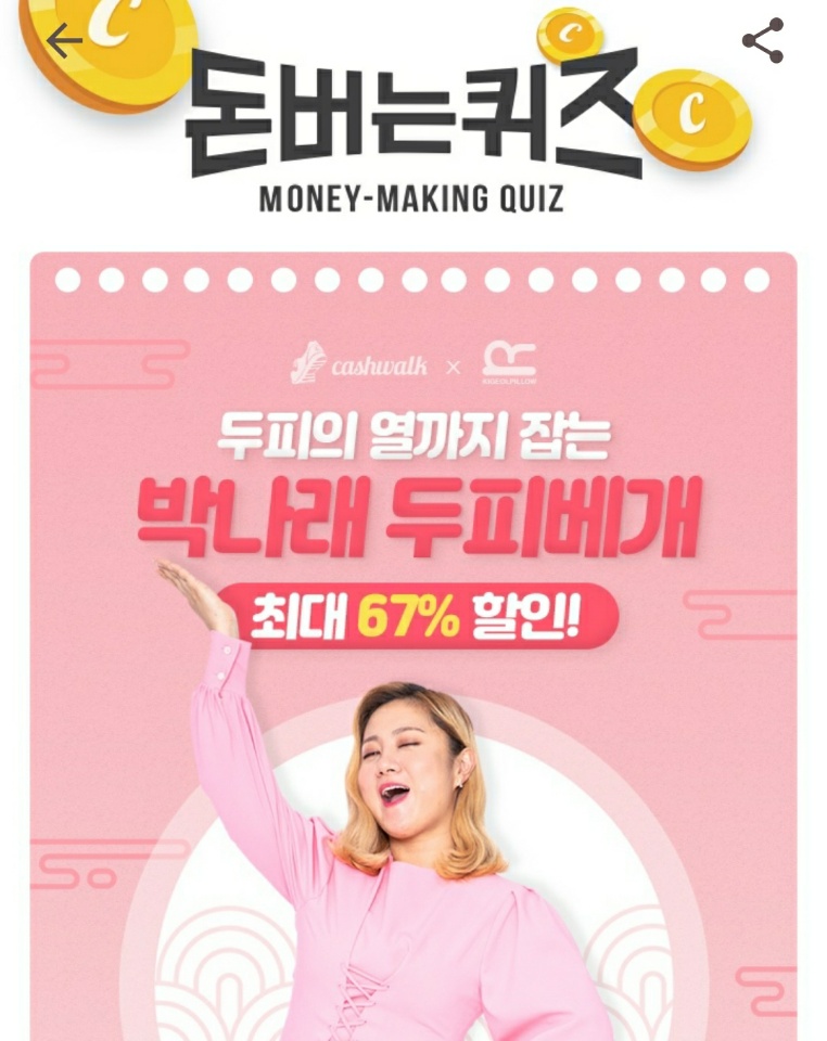 캐시워크 돈버는퀴즈 정답은? "박나래 숙면의 비밀! 두피베개 런칭기념 초측가 세일!" 퀴즈 정답 체크 후 랜덤 캐시 받아 가세요! 오늘의 캐시워크 정답을 알아보겠습니다.