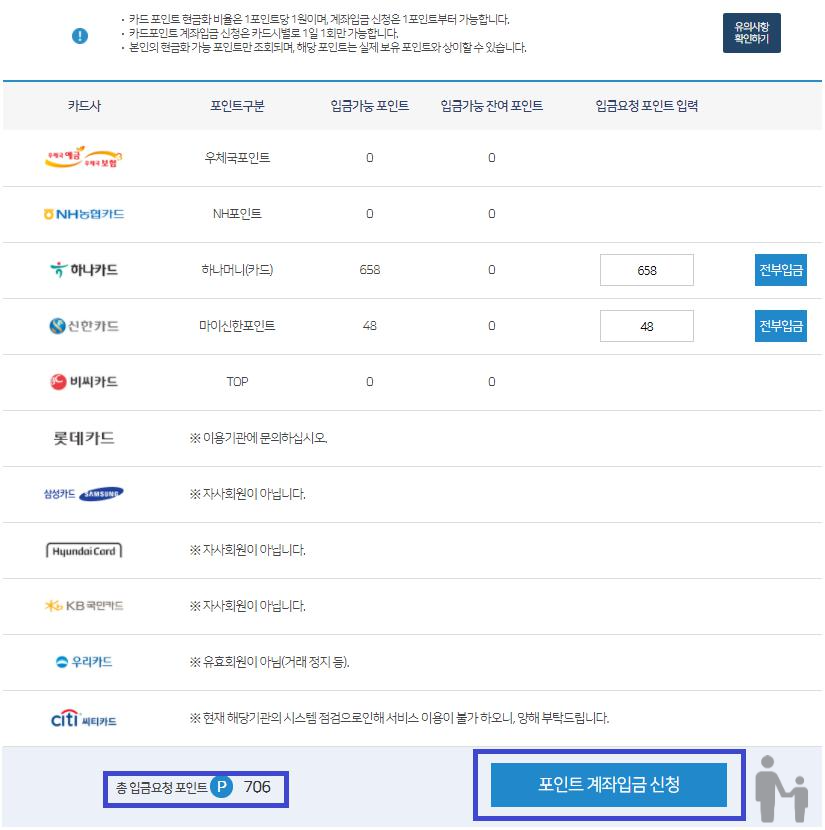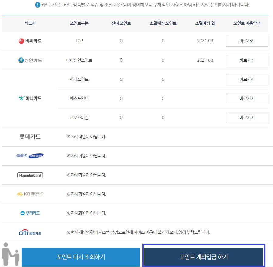 카드포인트 통합조회 계좌입금0