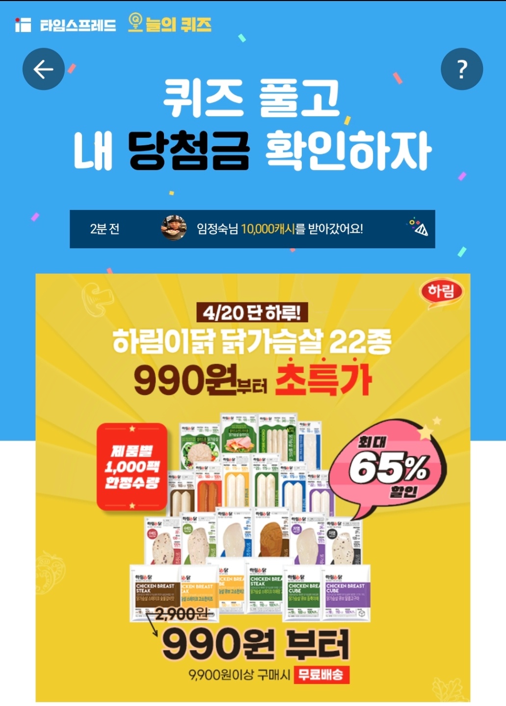 4월 20일 하림 닭가슴살 타임스프레드 오늘의 퀴즈