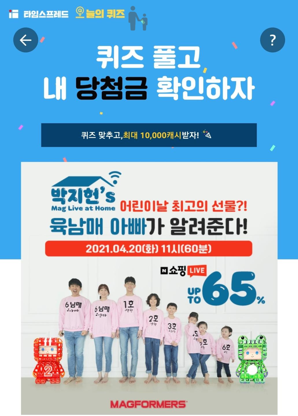 안녕하세요 쫀쫀 아빠입니다. 4월 20일 어린이날 한국짐보리 박지헌 타임스프레드 퀴즈 맞추시고포인트 혜택 받으세요!!! 해당 퀴즈는 캐시워크 돈버는퀴즈의 문제와 정답이 중복됩니다.