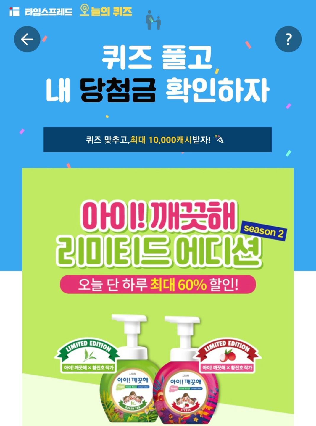 안녕하세요 쫀쫀 아빠입니다. 4월 20일 리미티드 에디션아이 깨끗해 타임스프레드 퀴즈 맞추시고포인트 혜택 받으세요!!! 해당 퀴즈는 캐시워크 돈버는퀴즈의 문제와 정답이 중복됩니다.