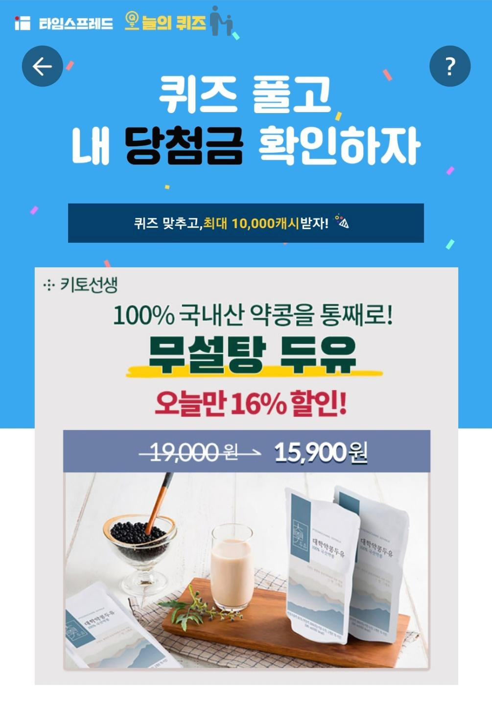 안녕하세요 쫀쫀 아빠입니다. 4월 23일 무설탕두유 키토선생 대학약콩두유 타임스프레드 퀴즈 맞추시고포인트 혜택 받으세요!!! 해당 퀴즈는 캐시워크 돈버는퀴즈의 문제와 정답이 중복됩니다.