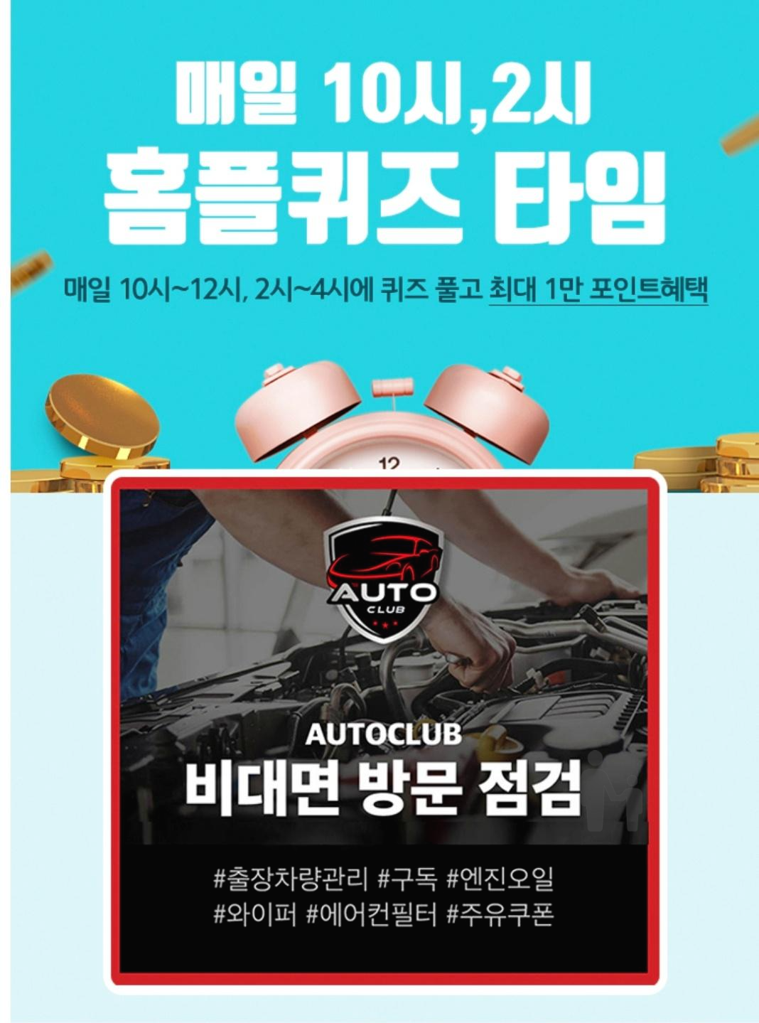 2시문제: 차량 정비 구독 고객님이 편하시도록 쉽고 간편한! 찾아가는 비대면형 방문정비 구독서비스! 차량 관리가 어렵거나 번거로운 고객들에게 최고인 서비스에요 전문 매니저가 연 2회 고객이 원하는 장소에 방문하여 차량을 진단해 드리고, 엔진오일 1회, 향균필터 1회, 와이퍼 2회 등 소모품도 함께 교체해 드립니다. 또한, 매달 GS칼텍스 주유권 OOO 할인쿠폰과 홈플러스 5천원 할인쿠폰을 제공 해 드리며 기본 운전자 보험 혜택까지 드립니다. 쏘나타 기준 월 19,000원에 연간 30만원 이상의 혜택을 드리는 혁신적인 서비스, 또한, 구독서비스에 가입하는 모든 고객에게 홈플러스 상품권 5만원을 추가 제공하는 혜택까지!! 지금 바로 확인하세요!!
